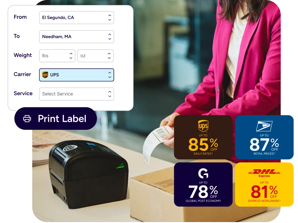 implify fulfillment and easily print shipping and return labels from your home or office. Access exclusive carrier discounts up to 90% off, save hours every week by automating manual tasks, and print labels—one at a time or in bulk—using any standard printer. Track every shipment from creation to delivery, and keep your business moving without ever waiting in line.