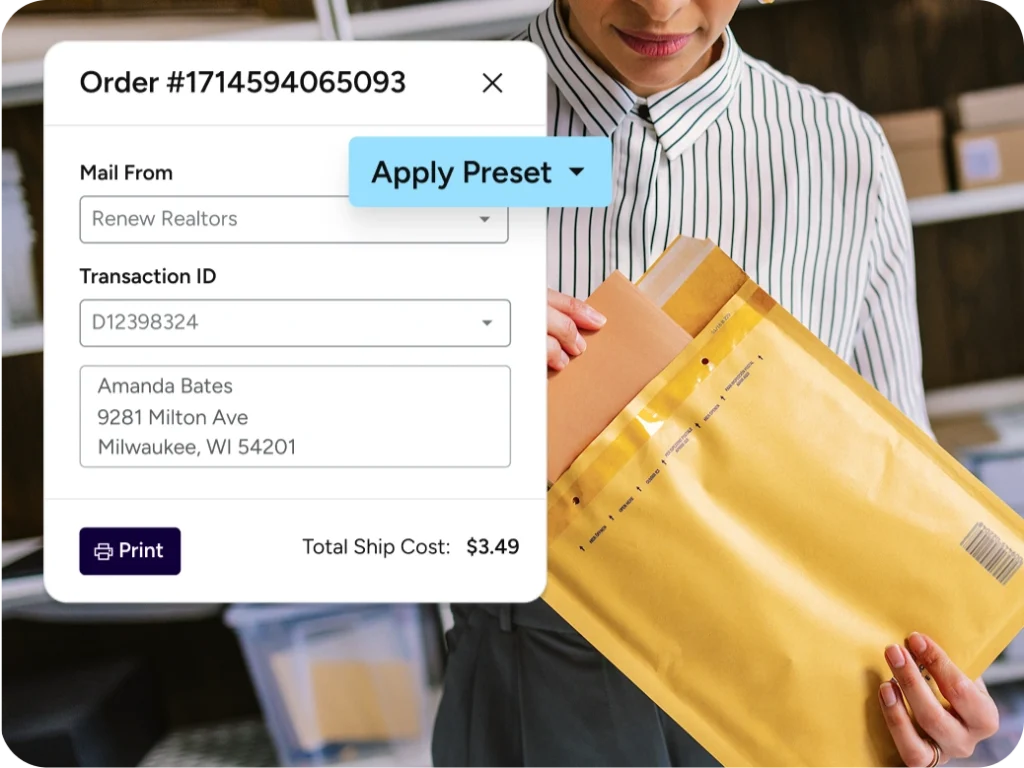 Save money where it counts. Access discounted USPS, UPS, FedEx, and more—all in one easy workspace. Send letters, flats, Certified Mail, and packages with exclusive rates you won’t find at the counter. Print from any computer or phone, schedule pickups, and keep your shipping operations lean during peak listing seasons and closings.