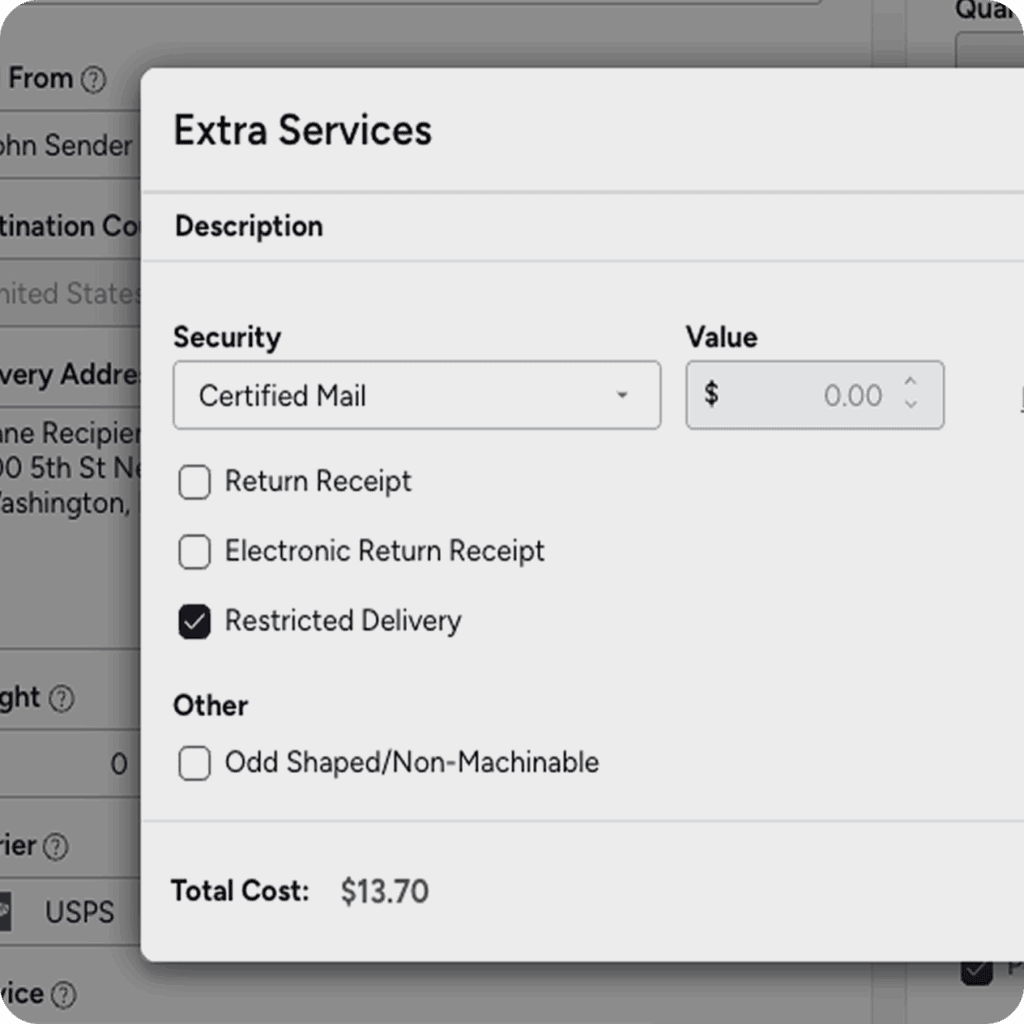 Save where it matters most. Access discounted USPS®, UPS®, FedEx®, DHL®, and GlobalPost® rates from one dashboard. Send letters, Certified Mail®, or small parcels with exclusive discounts unavailable at the counter. Print anywhere, schedule pickups, and simplify mailing—no contracts, no hidden fees.