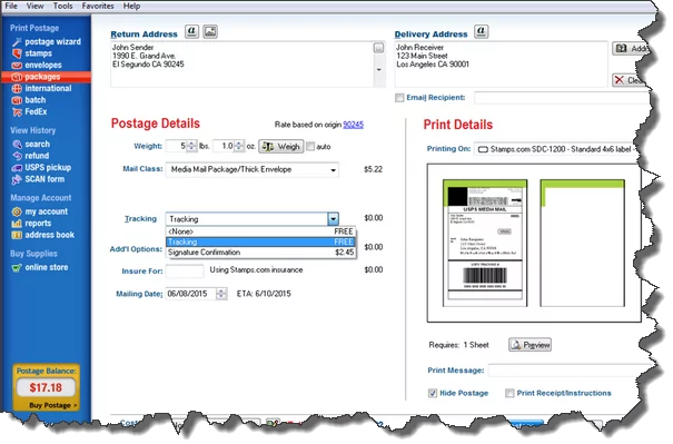 Stamps.com customers do not need to make any changes to their shipping processes to access free USPS Tracking for their Media Mail packages. Simply navigate to the “Packages” tab and select “Media Mail” in the drop-down menu for mail class. You will notice Tracking is included for FREE.