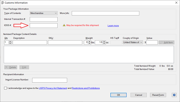 1) From the “International” tab, input the delivery address and package details. 2) In the “Customs” section, please click on the “Edit Form”. 3) Input your IOSS tax identification number in the designated field. Finish by clicking “Add Item” (on far right side) and then “OK”