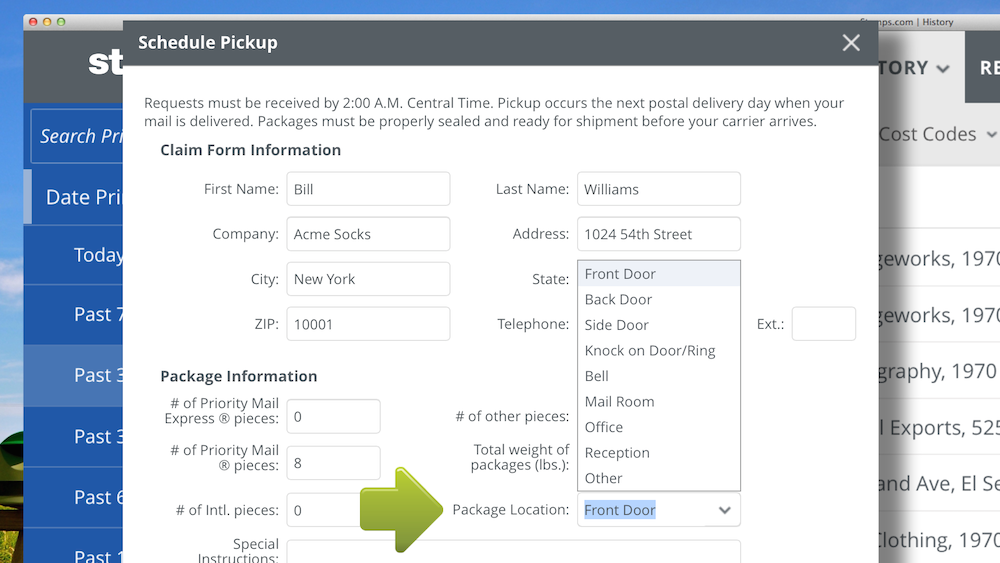 Select where at your location the postal carrier will pick up your packages and include any necessary notes/information.