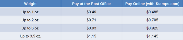 Postage for your First Class Mail wedding invitation is determined by how much the envelope weighs. You get a 1% metered mail discount if you use online postage with Stamps.com.