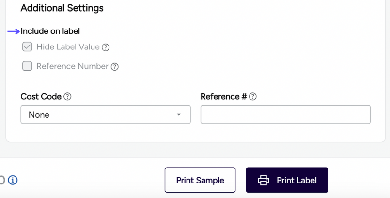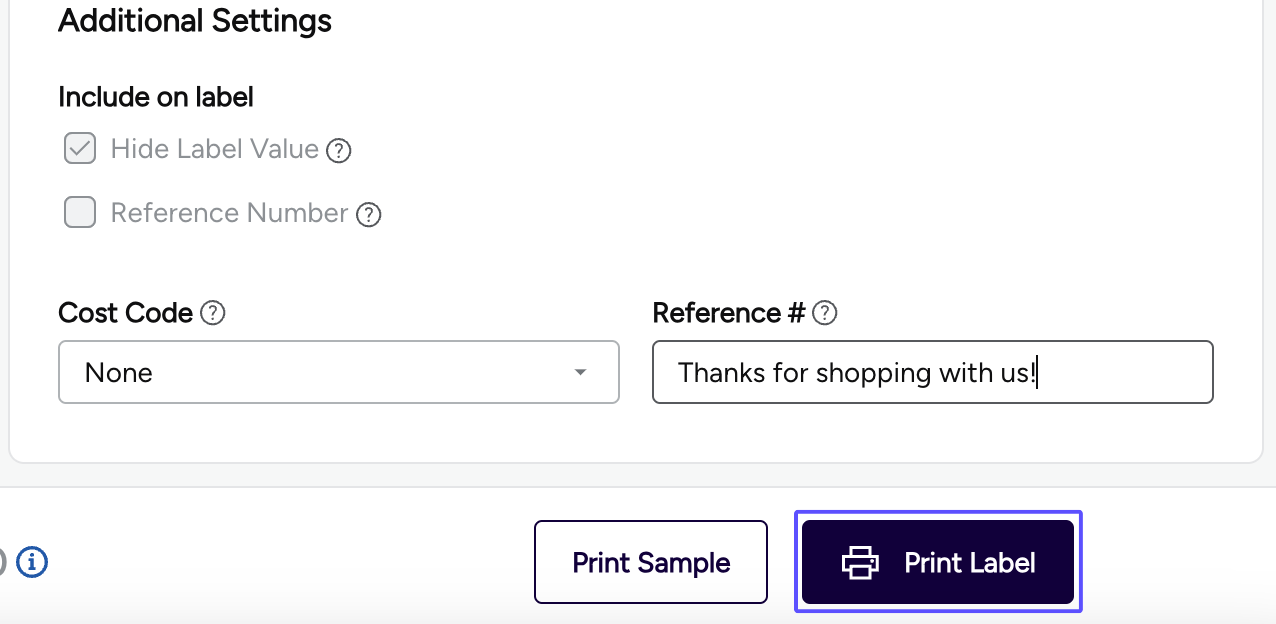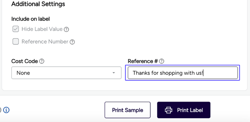 Print Reference #: Enable this option so you can enter a reference number or short message on your shipping label. If enabled, type your message into the Reference # field.