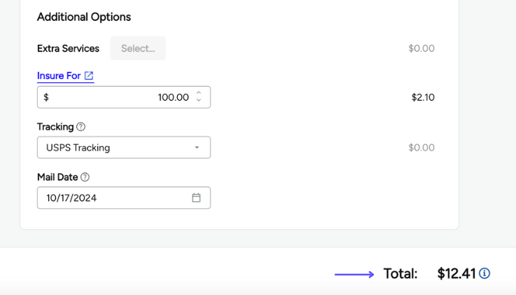 Mail Date: The mail date will always default to the date you are creating your postage. If you’re planning on mailing another day, be sure to change the mail date.