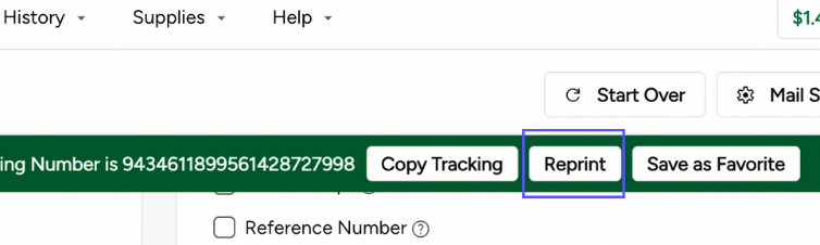 If your shipping label failed to print properly, you can reprint without an extra charge by clicking the Reprint button and following the onscreen prompts.