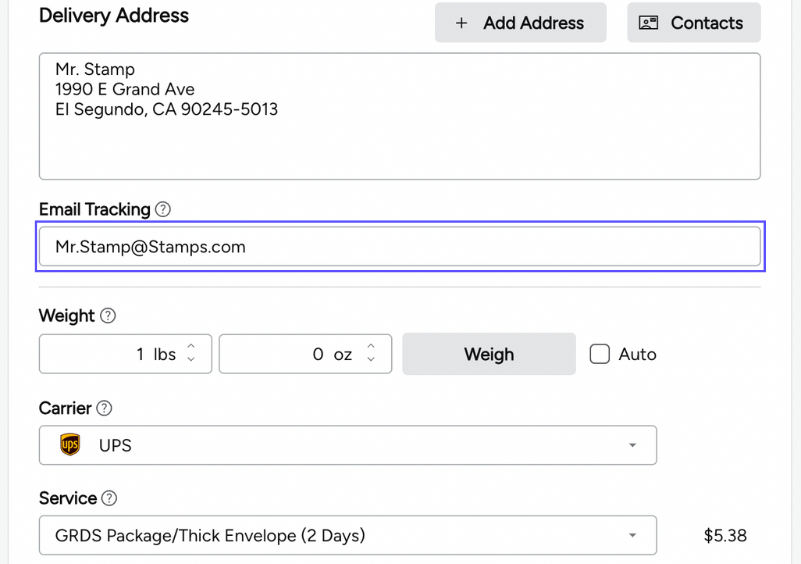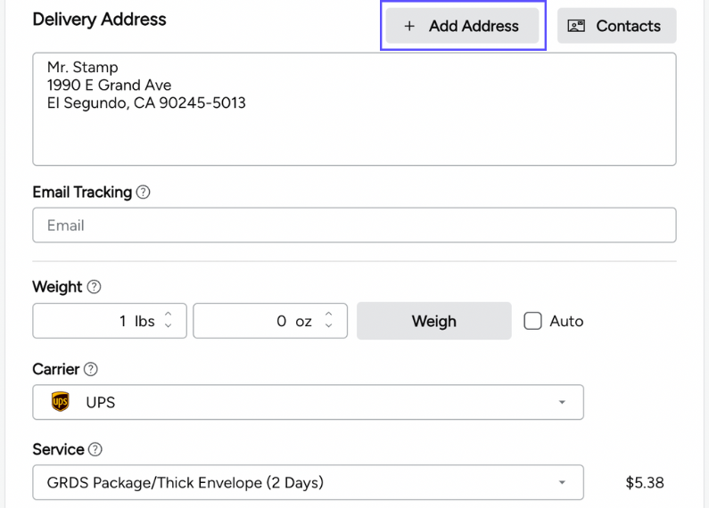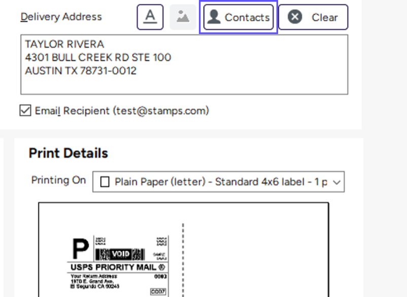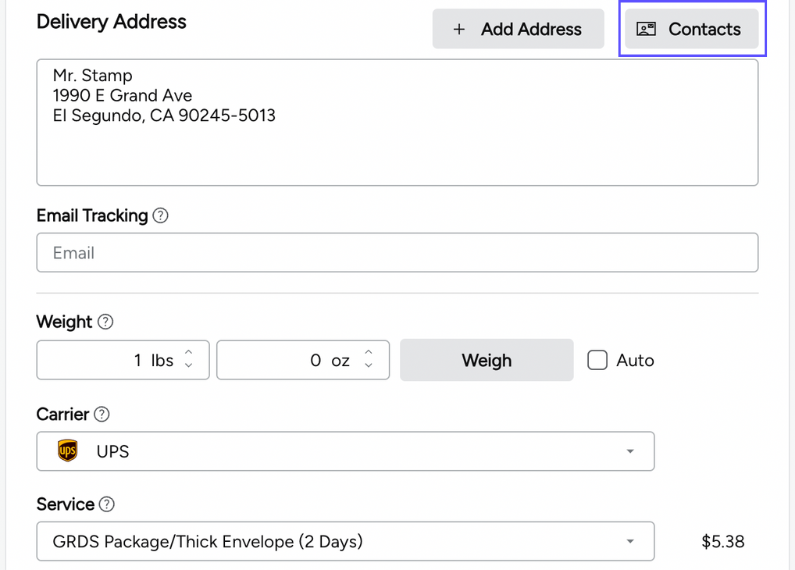 To create multiple labels at once, you’ll add multiple recipients to your Ship To field. You can add them manually or add them from your Contacts list. You’ll then prepare the shipment as you normally would.