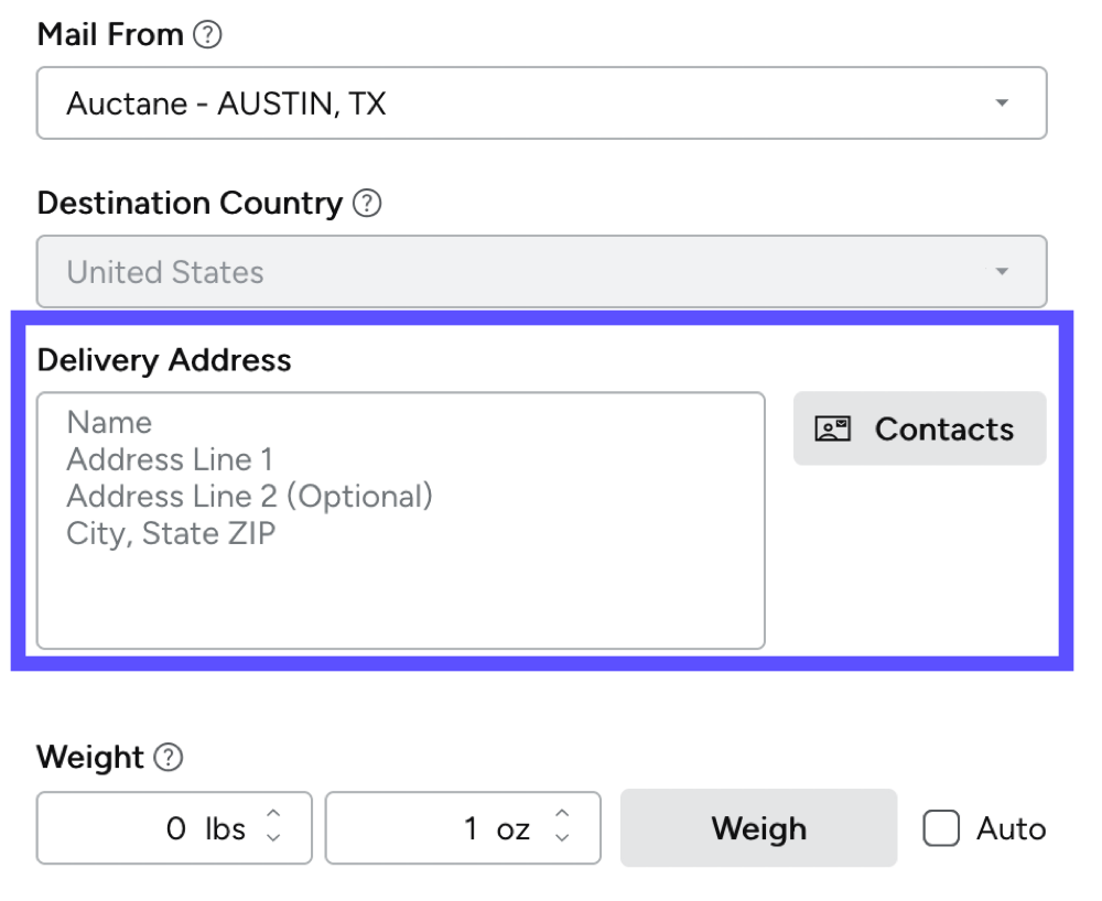 Ship To address: Enter the delivery address manually or select from your Contacts list.