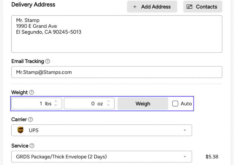 6. Enter the weight of your package. Or, if you use a postal scale, click Weight.