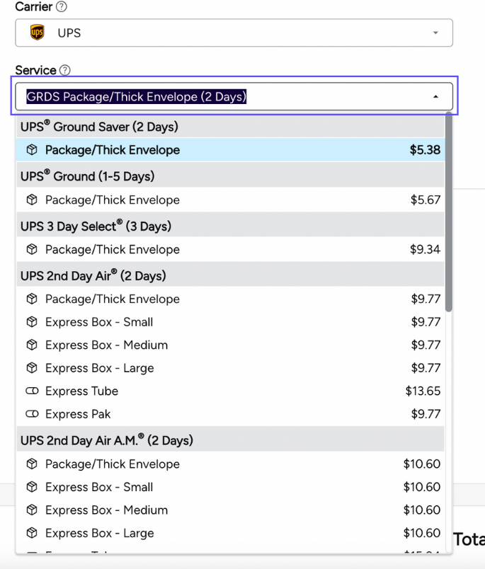 7. Select your desired service and package type from the Service drop-down menu.