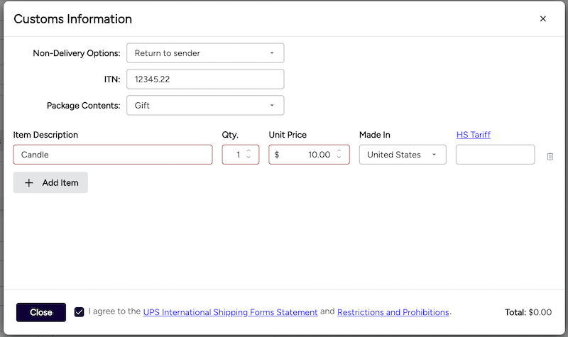 Items: International shipments must declare all items included in the shipment. Add an item with description, quantity, and unit price for each item included in the shipment.
