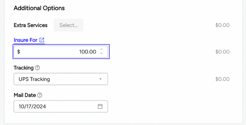 Insure For: This will add carrier insurance to your package. Set the value you wish to insure the package for.