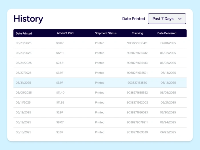 View and export your mailing history, expenses, and balances with built-in reports, which support everything from operations to finances. Move from a quick pulse check to deeper analysis in just a few clicks. Share printable summaries to highlight trends in volume, spend, and on-time delivery, or export a CSV to explore the raw data. With consistent definitions across every report, everyone stays aligned—and decisions happen faster.